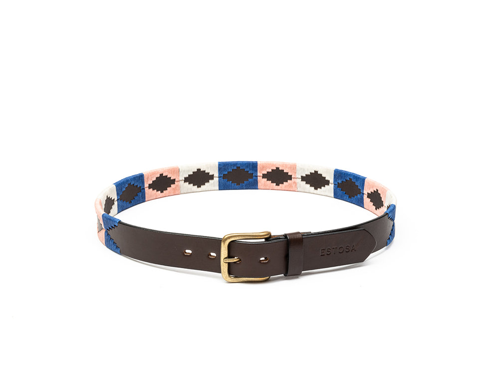 The Caballero navy/pink/ecru & brown leather polo belt with a golden buckle flawlessly encompasses the exceptional qualities that define Estosa handcrafted belts. With its stunning designs, unparalleled craftsmanship, and the use of the finest materials, this belt is meticulously crafted to elevate your attire and make a resounding statement of refinement.