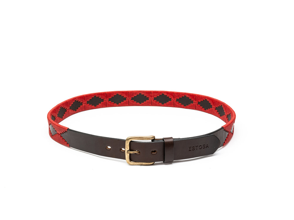 The Libertad red & brown leather polo belt with a golden buckle flawlessly encompasses the exceptional qualities that define Estosa handcrafted belts. With its stunning designs, unparalleled craftsmanship, and the use of the finest materials, this belt is meticulously crafted to elevate your attire and make a resounding statement of refinement.