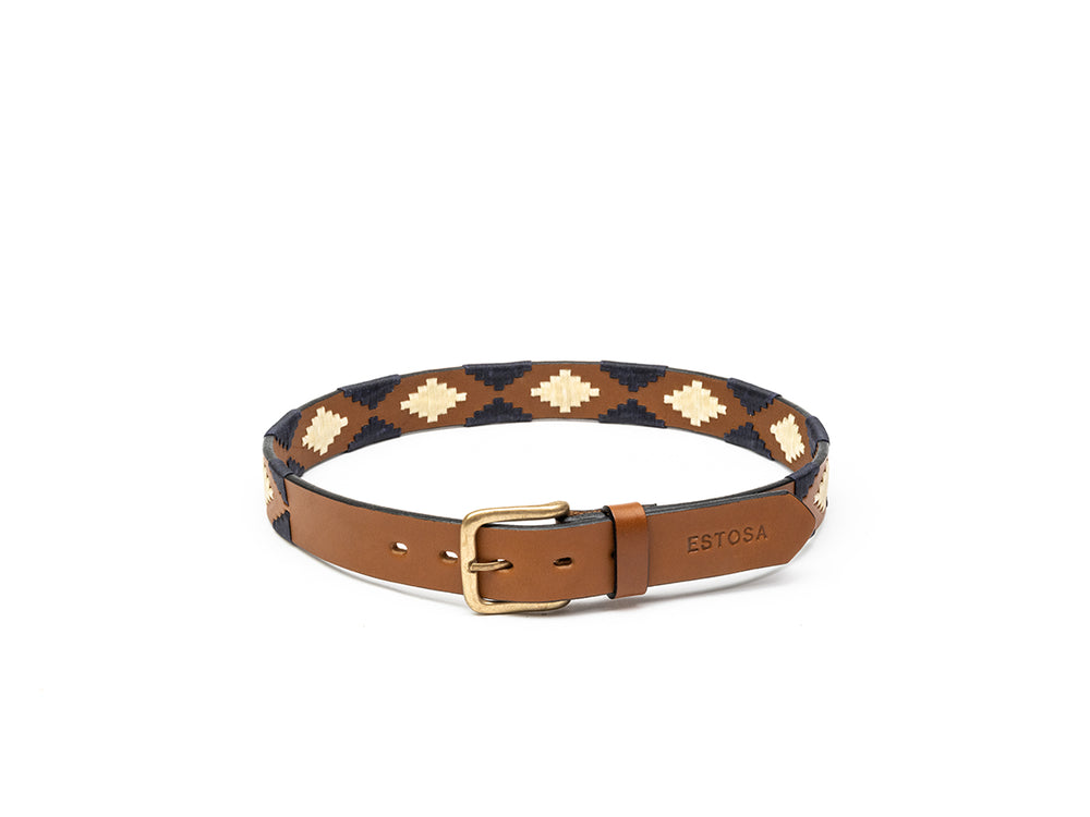 The Tango navy & ecru & tan leather polo belt with a golden buckle flawlessly encompasses the exceptional qualities that define Estosa handcrafted belts. With its stunning designs, unparalleled craftsmanship, and the use of the finest materials, this belt is meticulously crafted to elevate your attire and make a resounding statement of refinement.